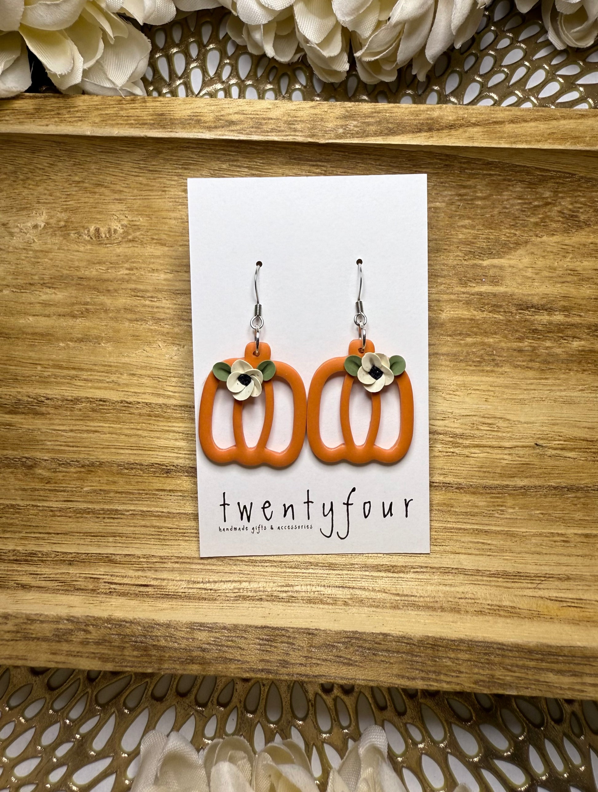 Polymer clay earrings. Pumpkin dangle earrings with hand cut florals on stainless steel posts.